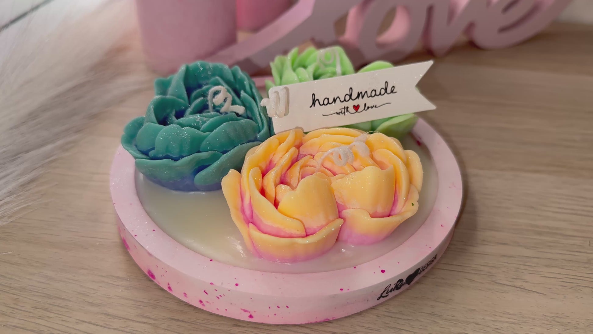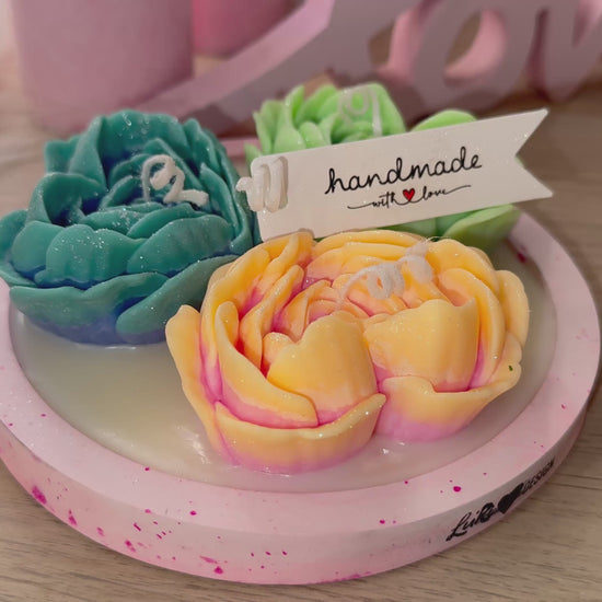 Zarte handgegossene Blüten aus Sojawachs, liebevoll auf einem Gips-Tablett arrangiert.