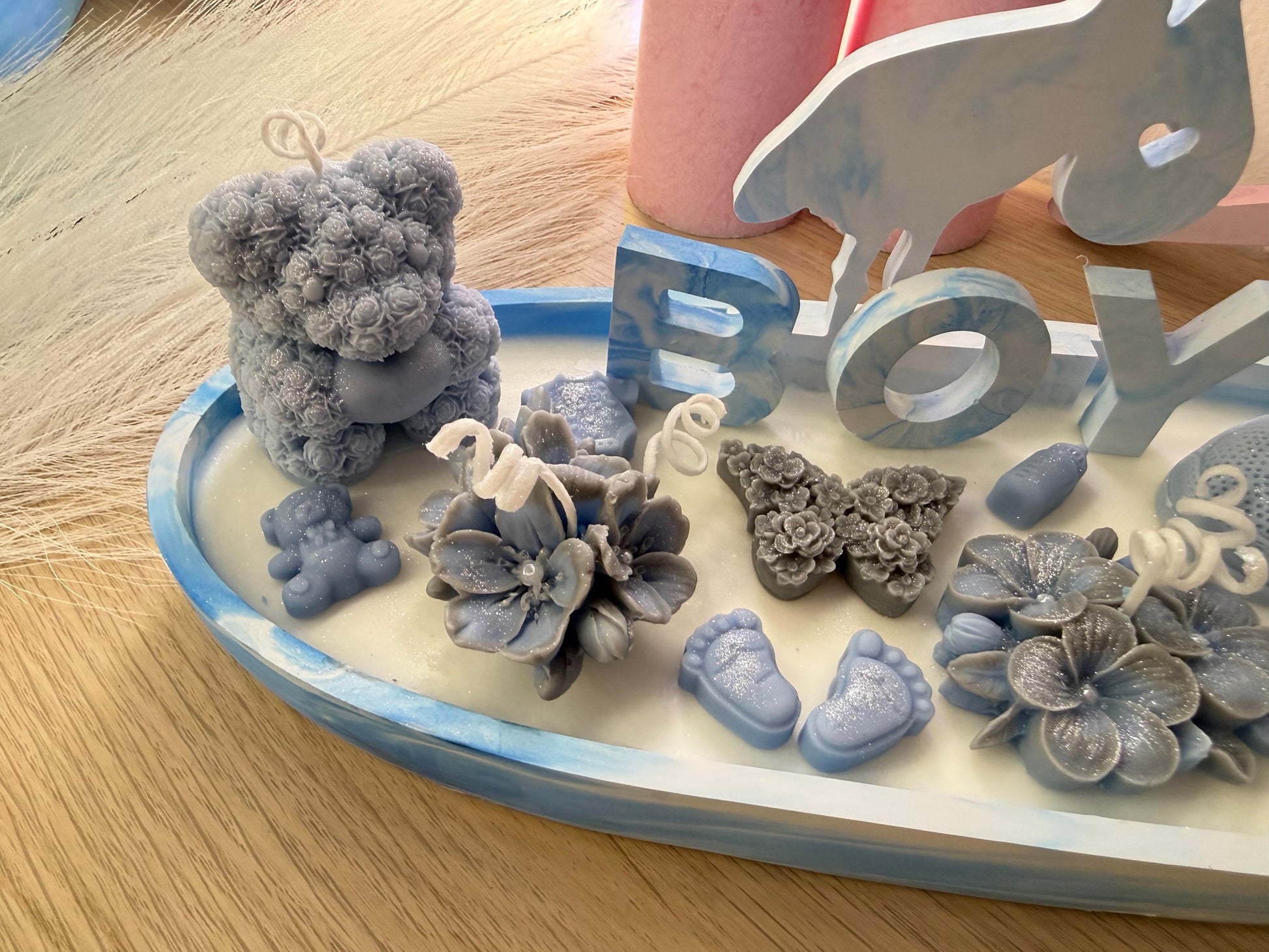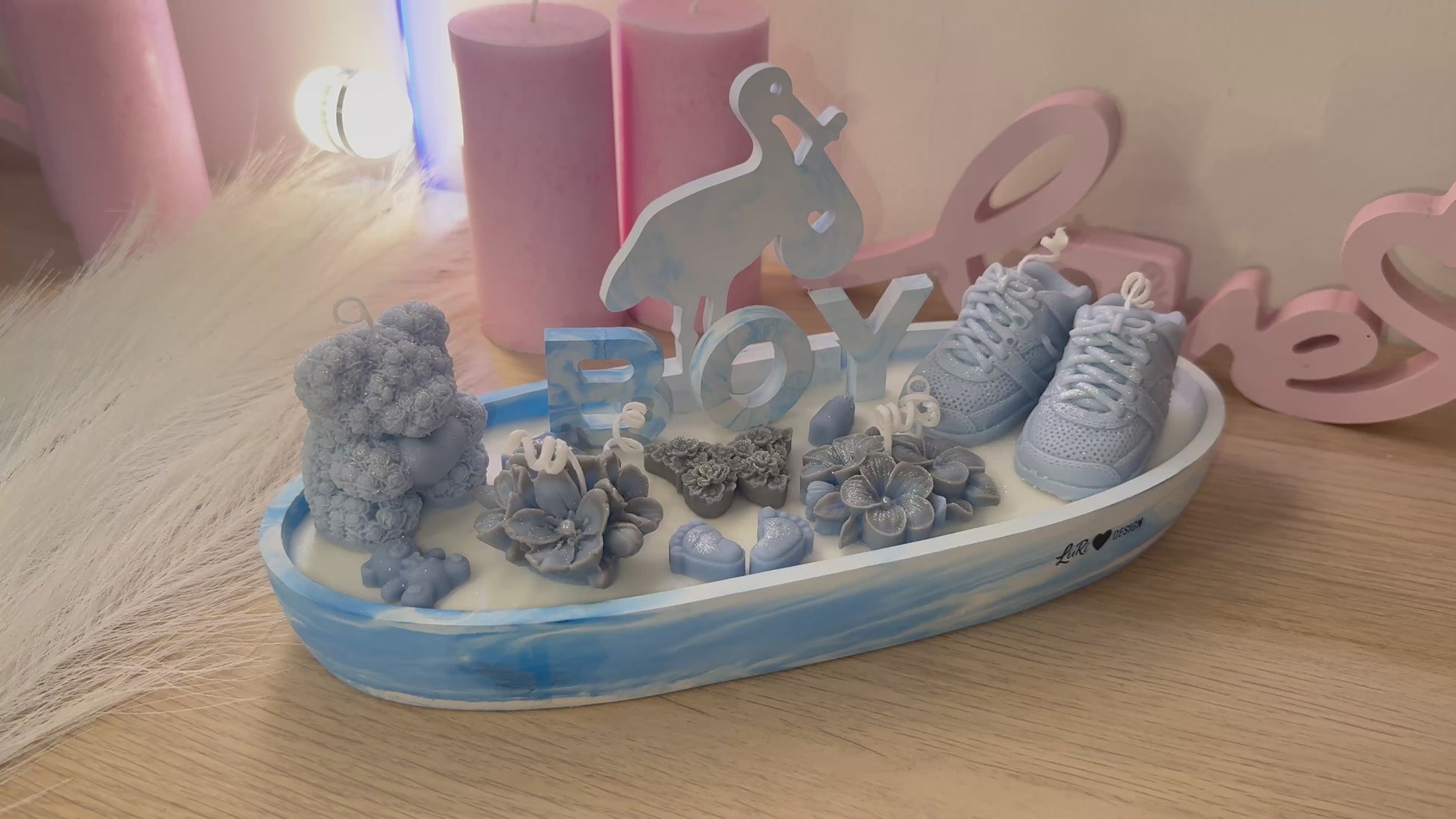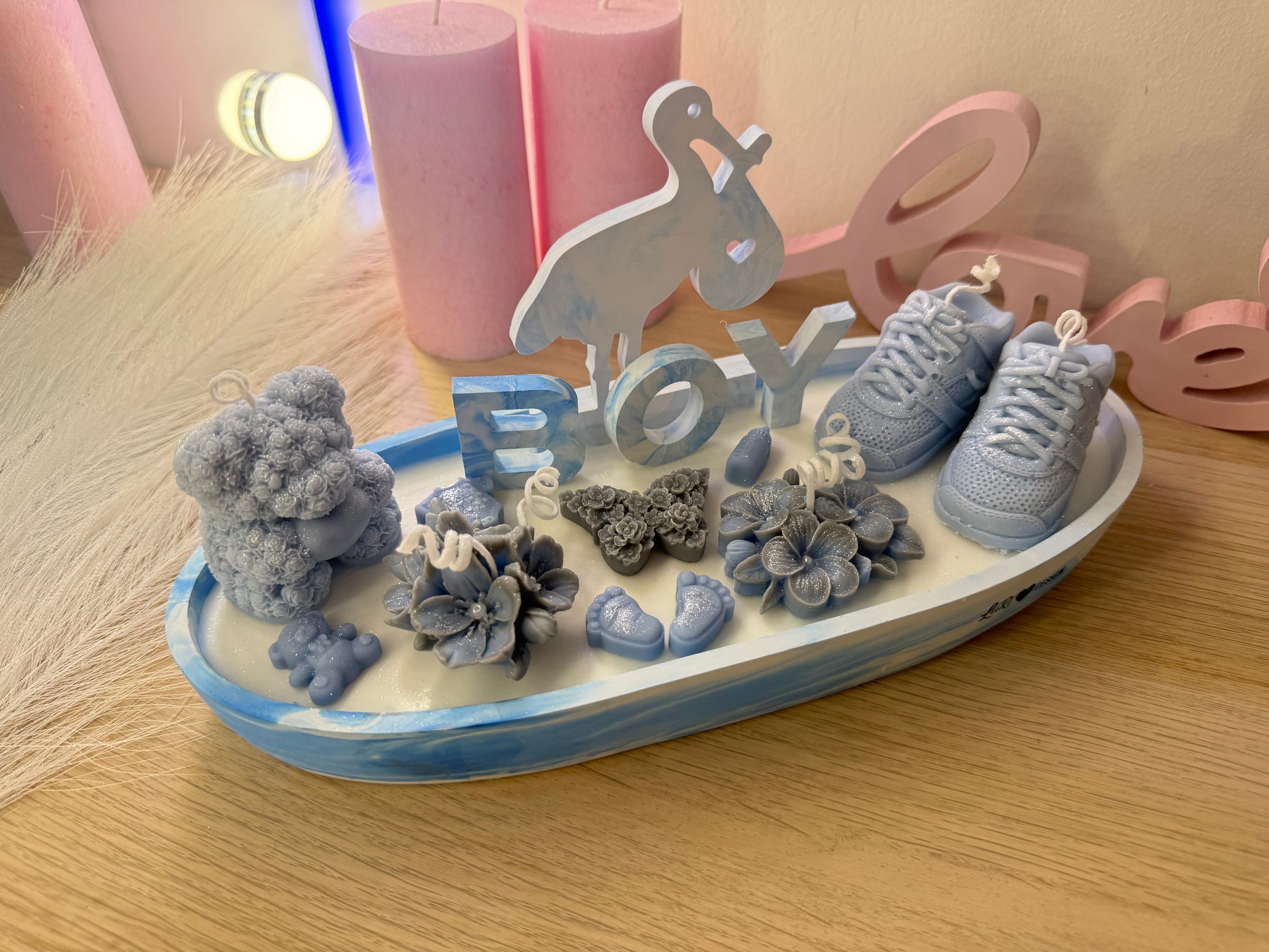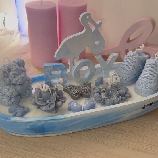 Diese große Babyshower-Kerzenschale (28 cm) ist ein außergewöhnliches und hochwertiges Geschenk zur Geburt oder Babyshower.