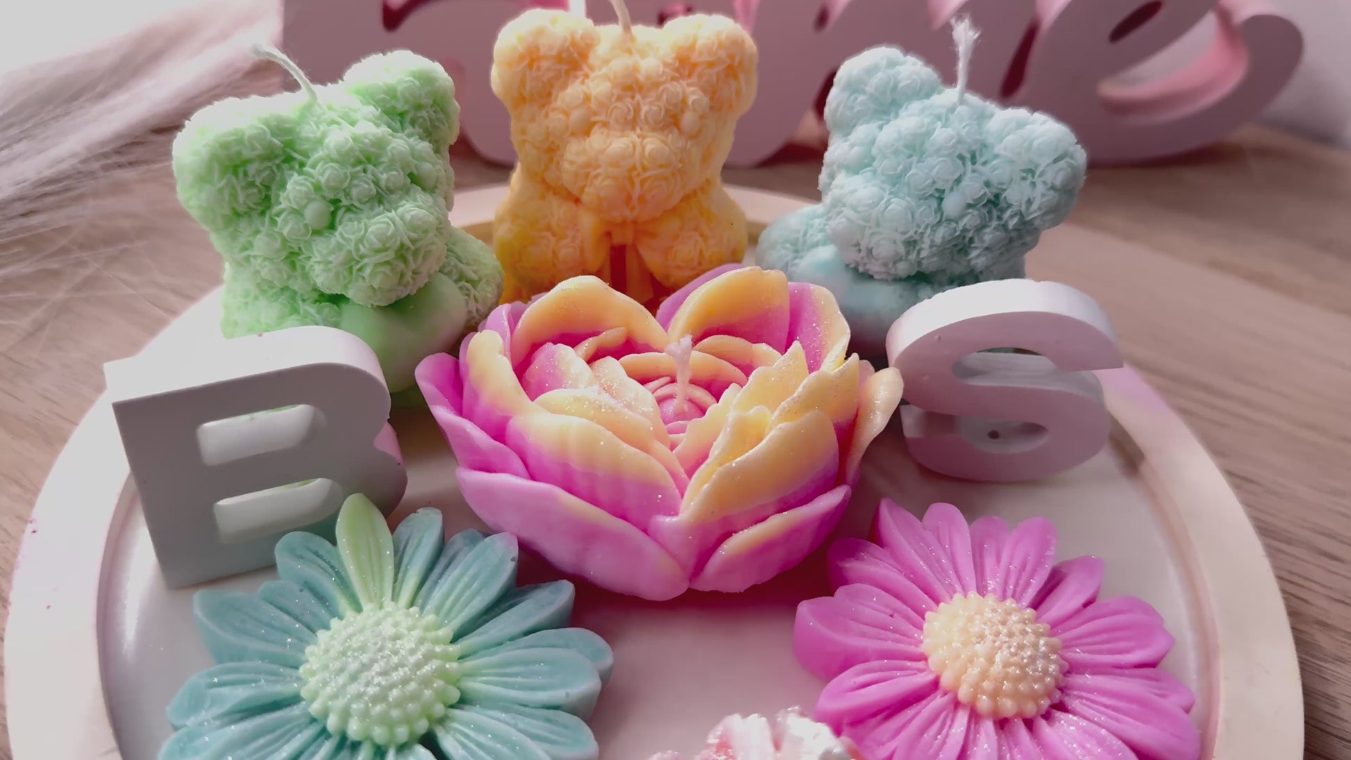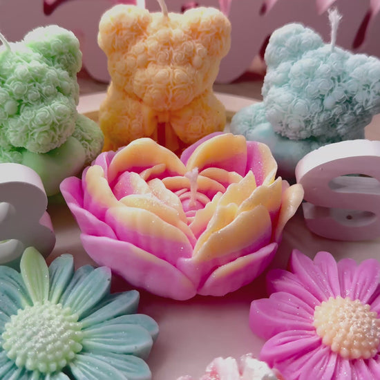 Handgemachte Deko-Kerzen – moderne Blumen & Bären | Geschenkidee für Hochzeit, Pärchen & Jubiläum – personalisierbares Geschenk