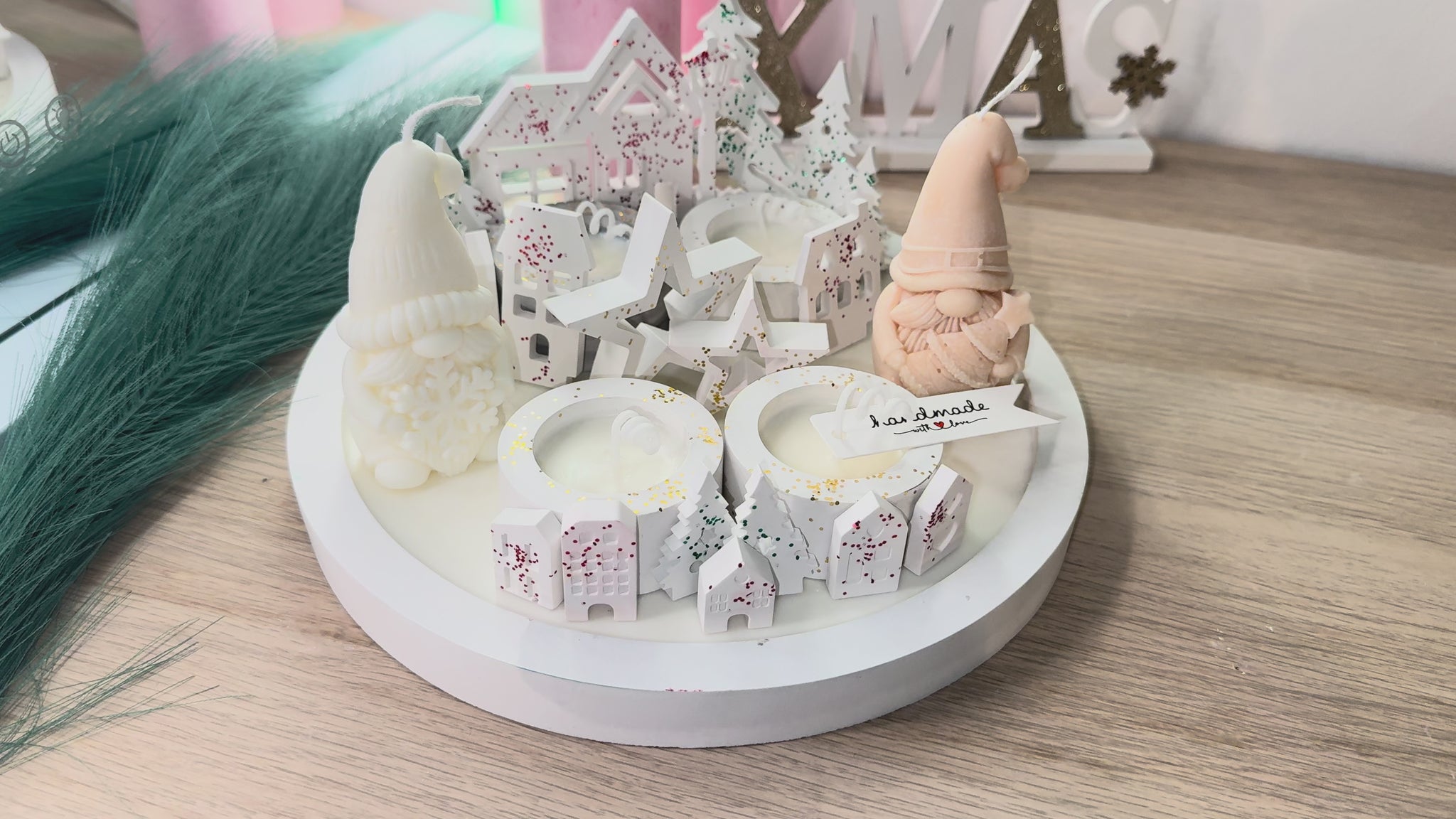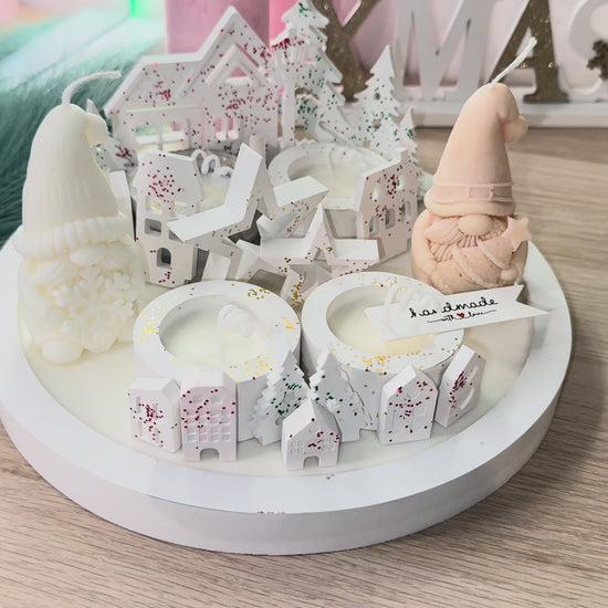Dieses detailreiche Deko-Set bringt winterliche Wärme in dein Zuhause: Zwei liebevoll gestaltete Wichtelkerzen, kleine Häuser, Bäumchen und Sterne aus hochwertigem Sojawachs arrangieren sich auf einem handgegossenen Gips-Teller zu einer kleinen Winterlandschaft.