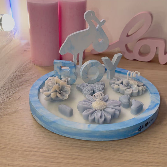 Handgefertigter Babyshower-Teller (19 cm) als liebevolles Geschenk zur Geburt oder Babyparty – personalisierbar mit Name, auch als Girl Version erhältlich.