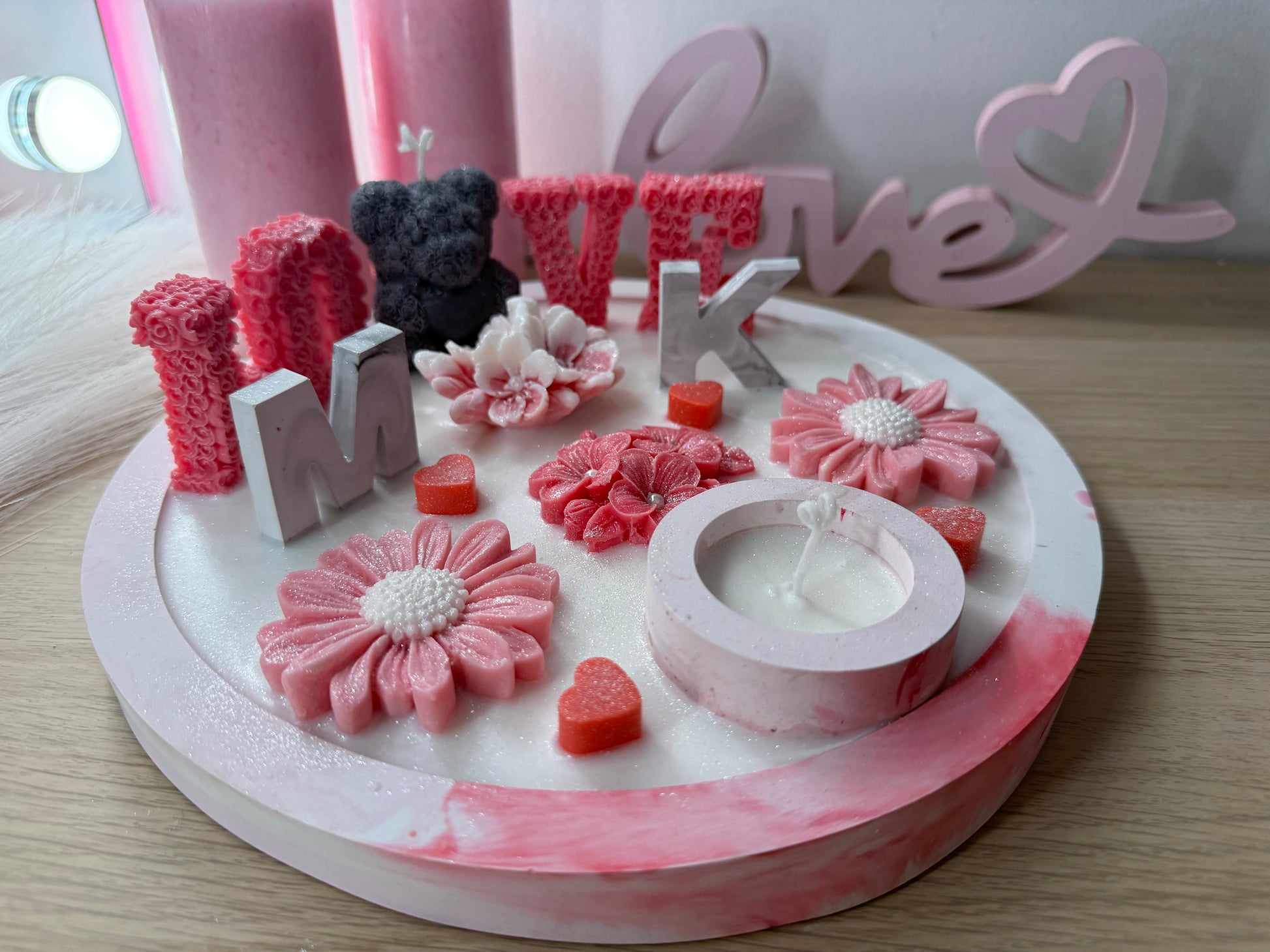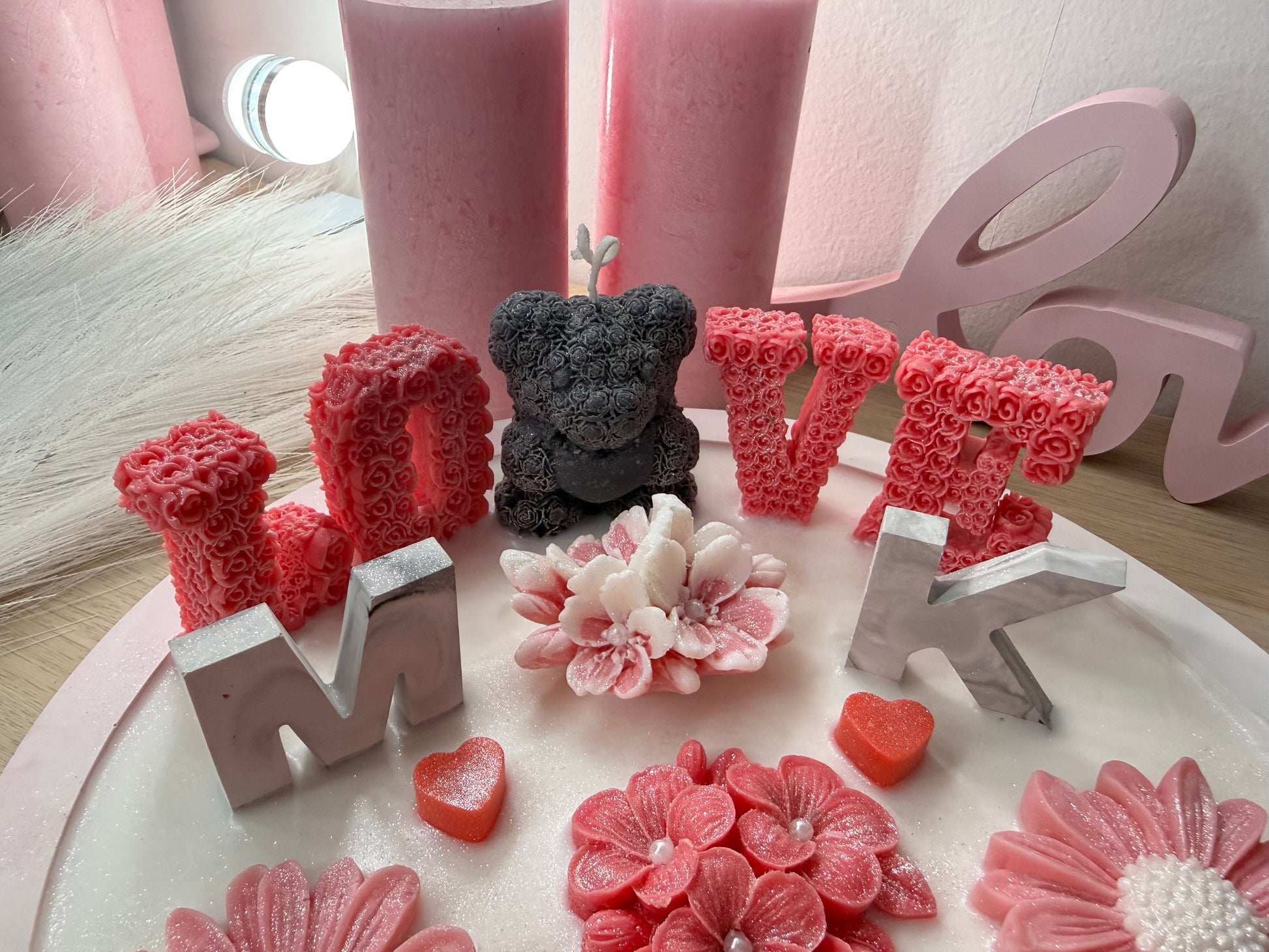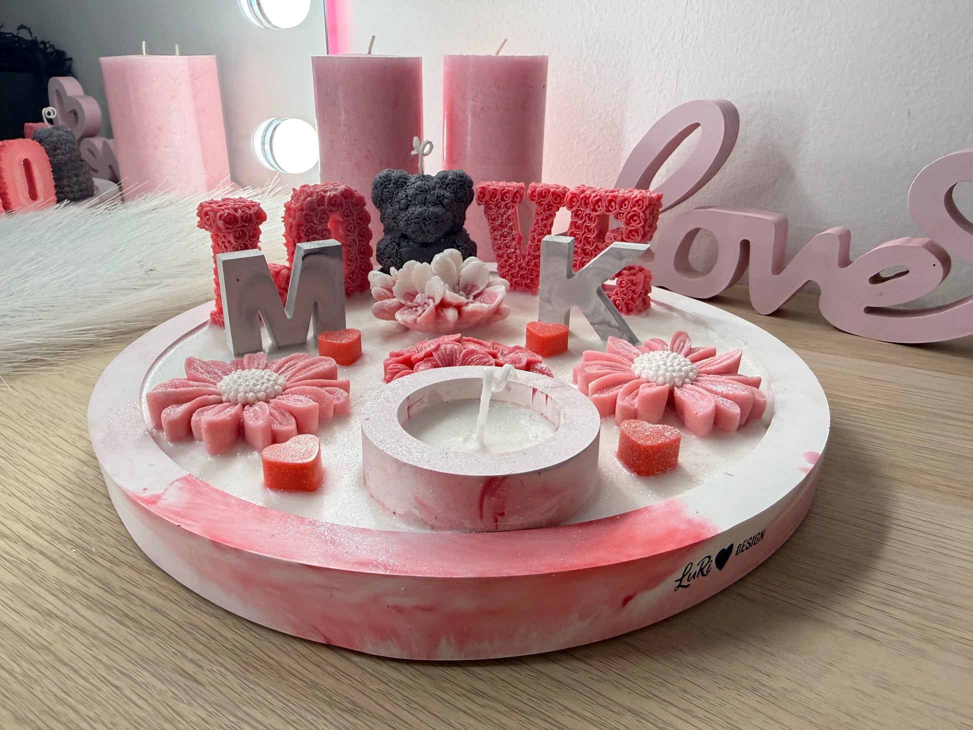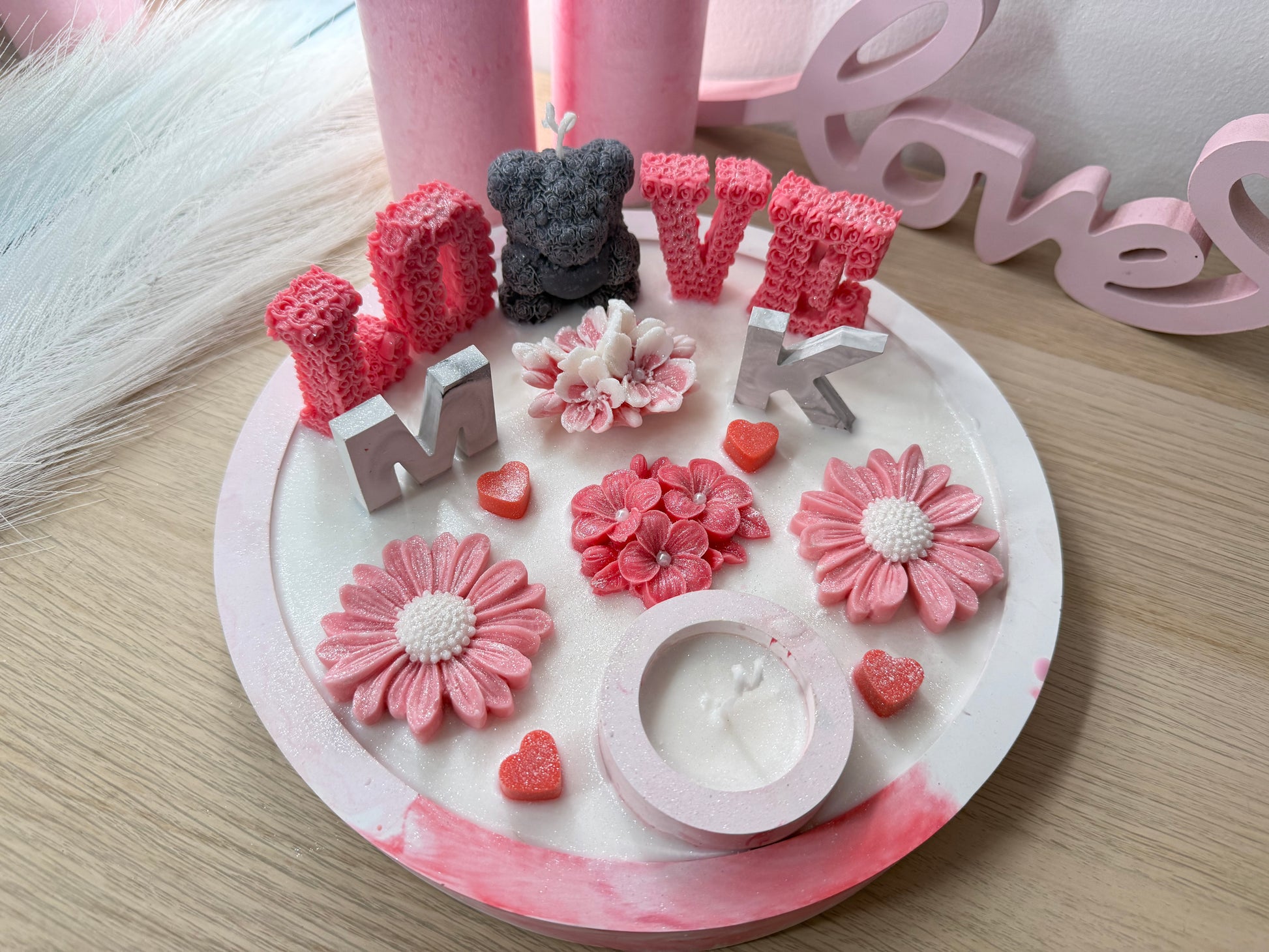 LOVE-Schale Rosa XXL– Handgegossene Deko-Schale mit Blüten, Bärenfigur & Initialen (personaliserbar)