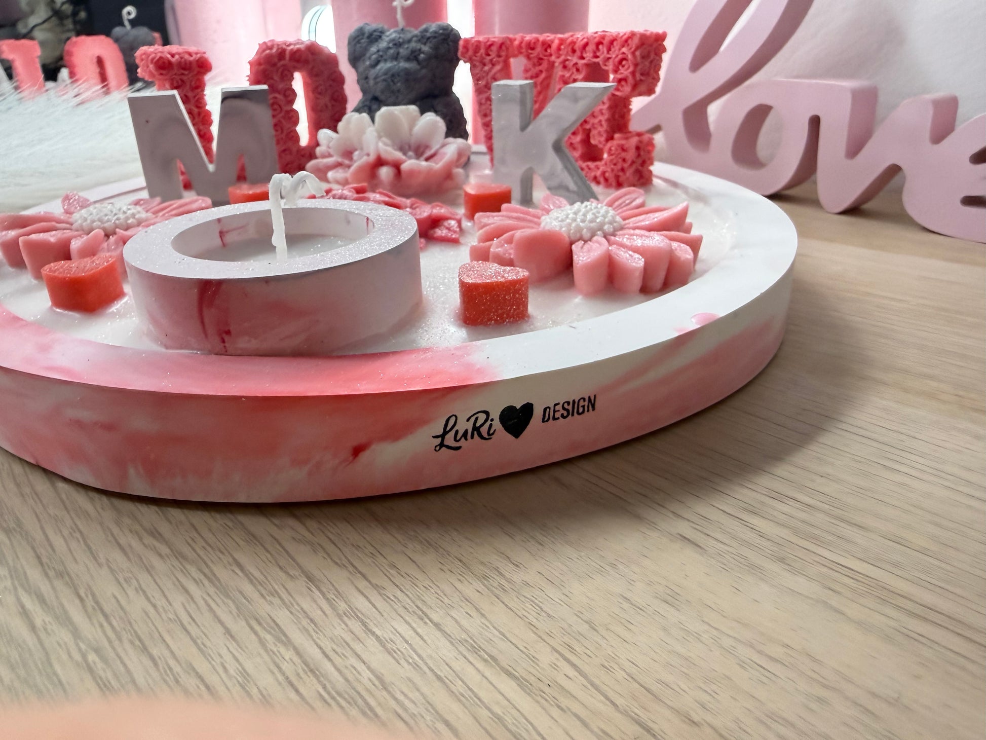 Diese liebevoll gestaltete LOVE-Schale ist ein einzigartiges Deko-Highlight und ein wunderschönes Geschenk für besondere Menschen. Die handgegossene Kombination aus zarten Rosatönen, Blütenelementen, Initialen und einer süßen Bärenfigur schafft eine warme, romantische Atmosphäre – perfekt für Valentinstag, Muttertag, Geburtstage oder einfach als kleine Geste von Herzen.