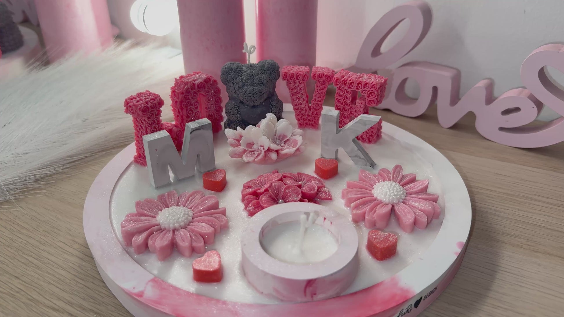 Die Schale wird aus hochwertigem Gips gefertigt, farblich marmoriert und anschließend einzeln dekoriert. Die zart glitzernde Wachsfläche bildet das Herzstück und trägt die aufgestellten Elemente wie Blüten, Buchstaben und kleine Dekoherzen.