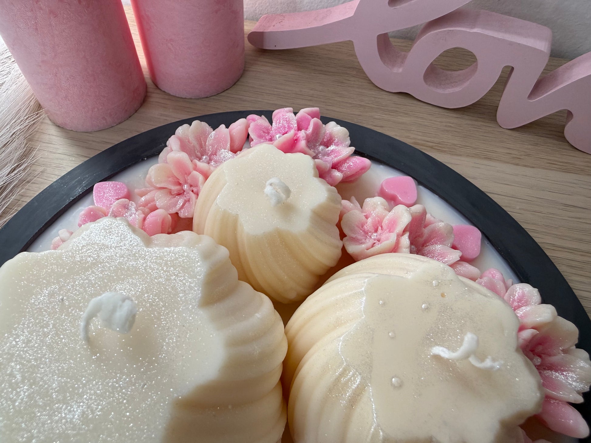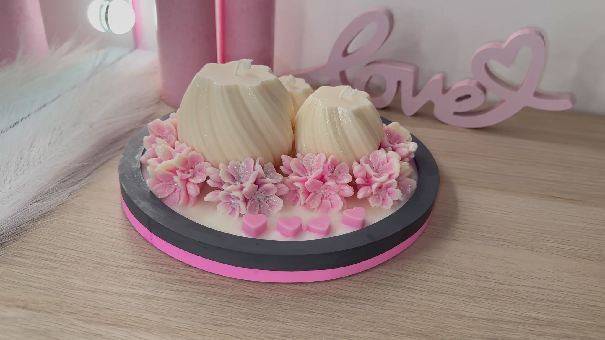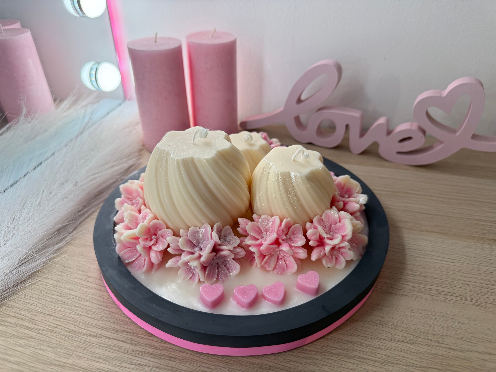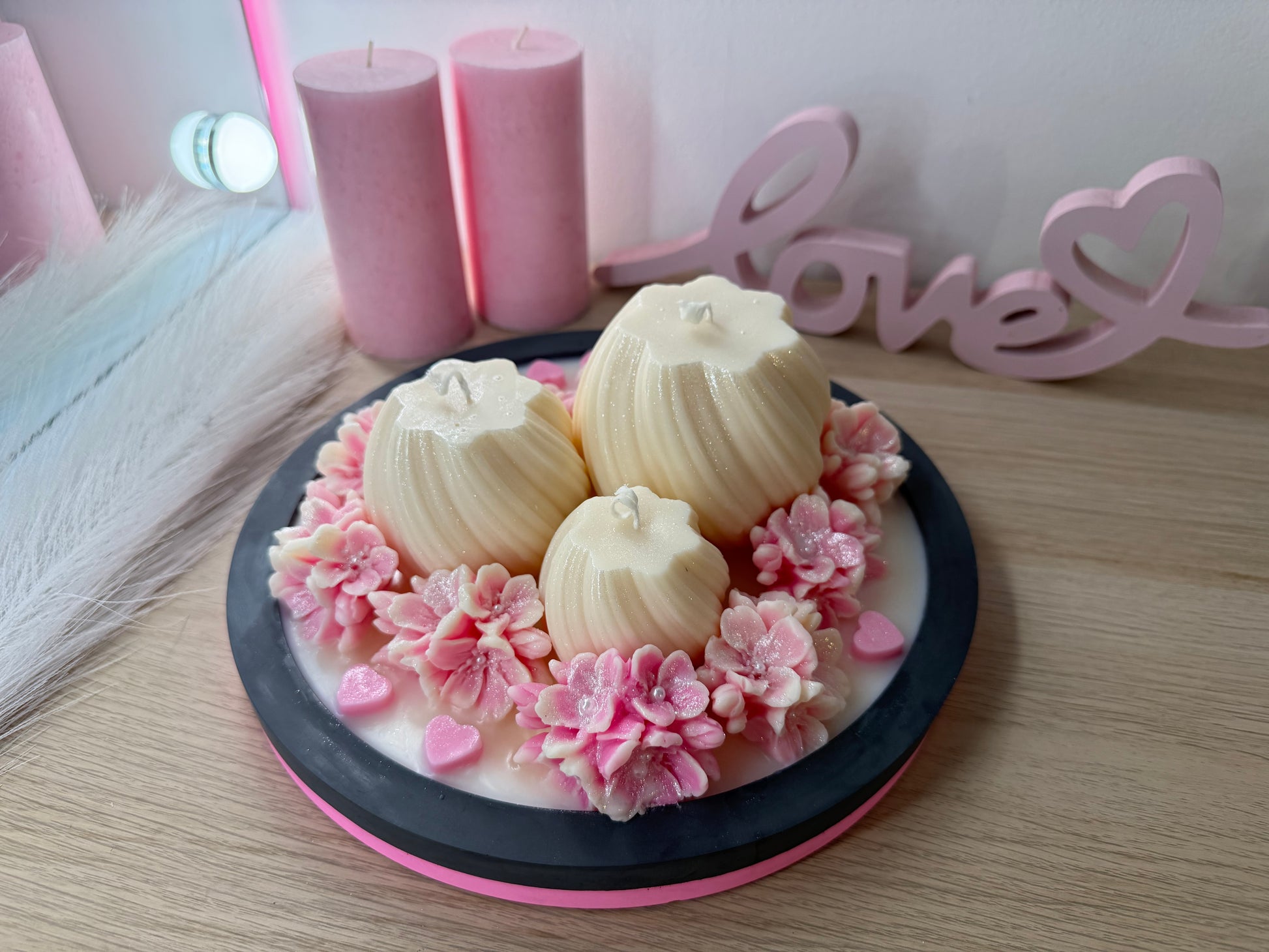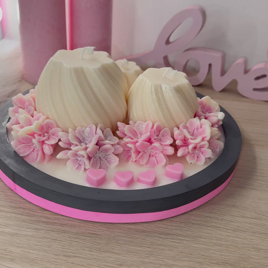 Luxus-Deko-Schale XXL mit 3 Kerzen & Blüten – Handgegossen | Geschenk zur Hochzeit, Liebe, Geburtstag | Optional personalisiert