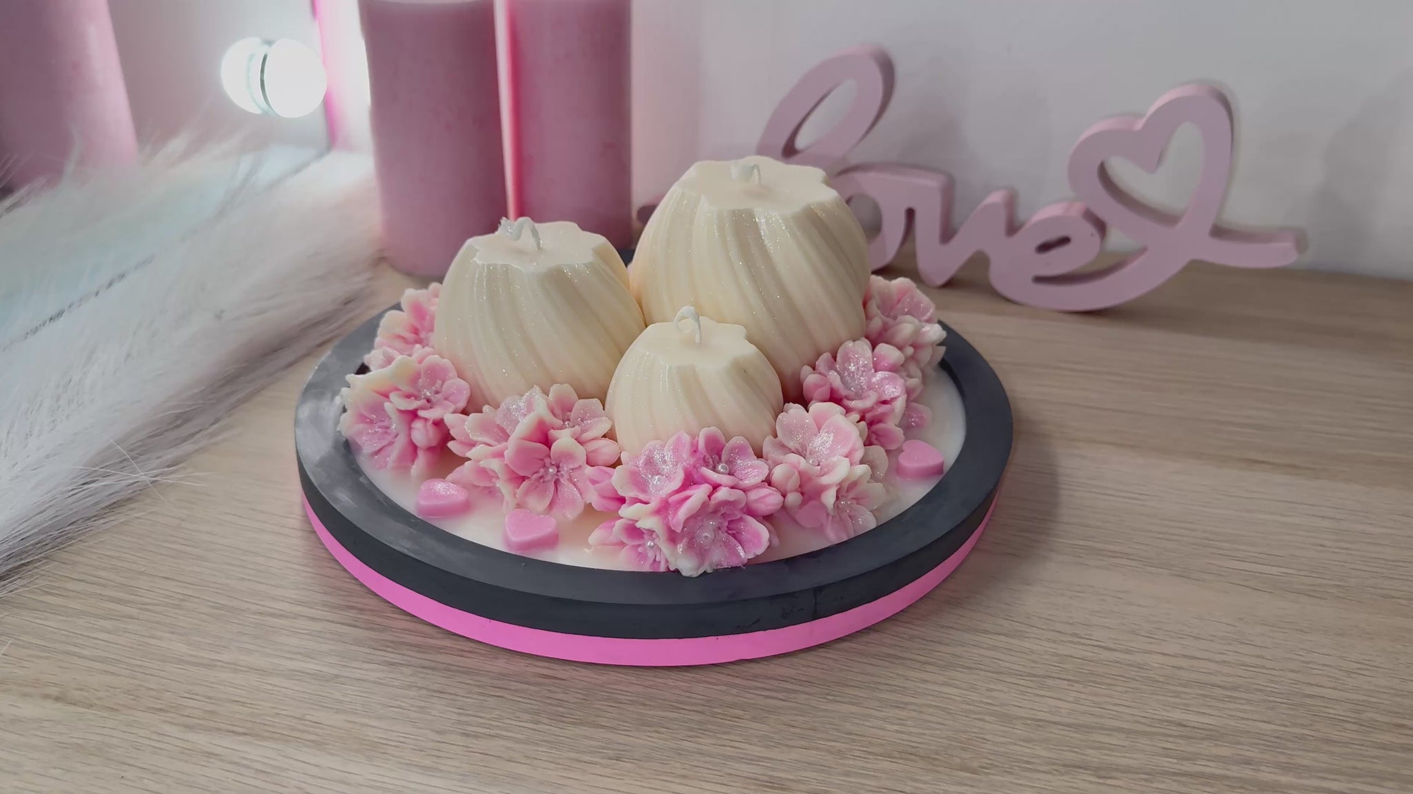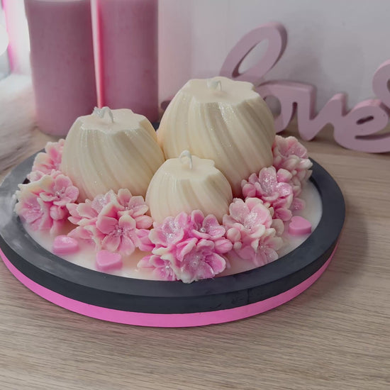 Diese luxuriöse Deko-Schale besteht aus drei elegant geformten Kerzen, umrahmt von handgegossenen Blüten, zarten Farbverläufen und feinem Schimmer.