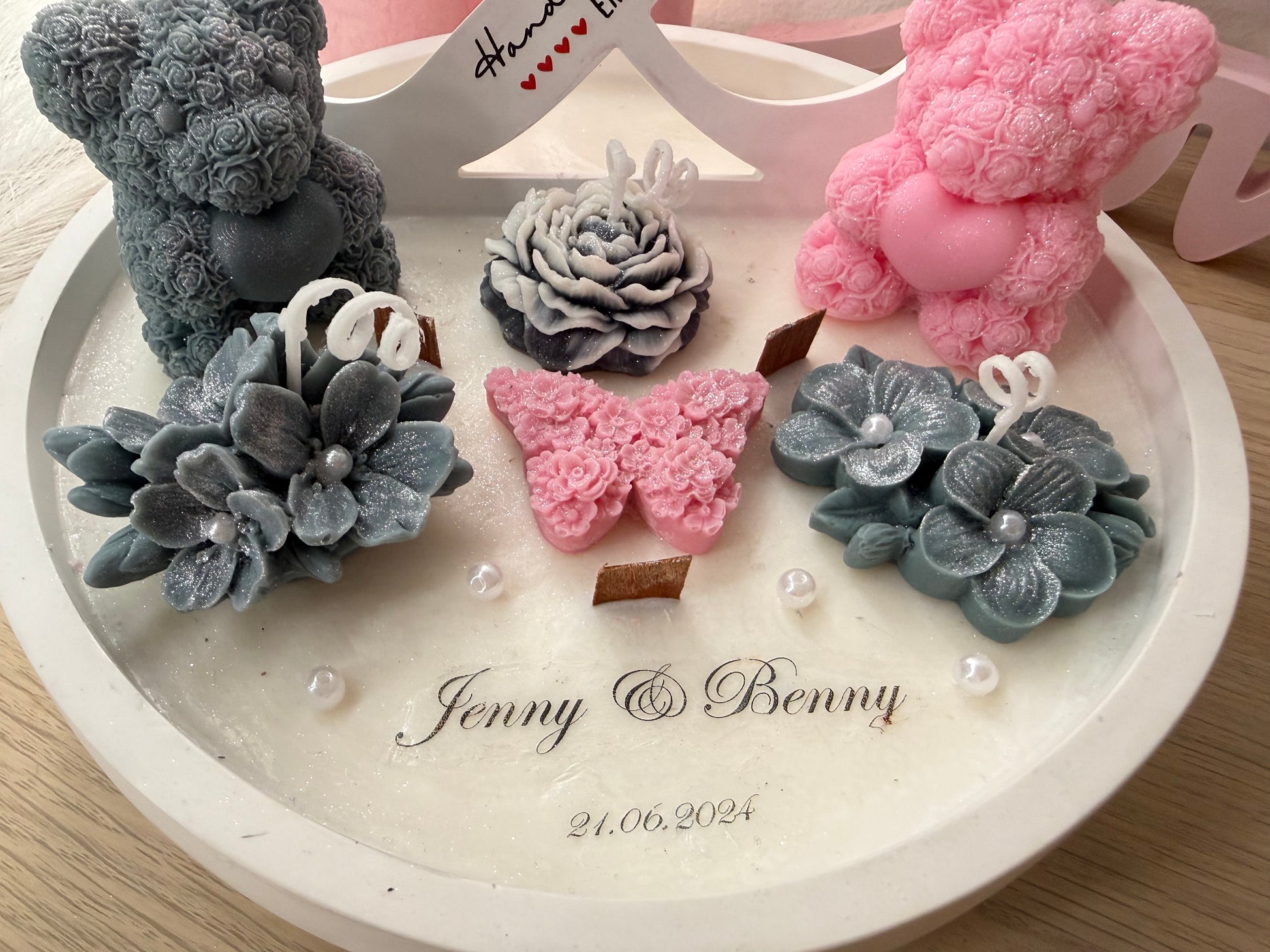 Romantische 22-cm Deko-Schale in Rosa & Grau – handgegossen, detailreich dekoriert und komplett personalisierbar mit Namen & Datum. Perfekt als Geschenk zur Hochzeit, Verlobung, Jahrestag, Valentinstag oder als besonderes Erinnerungsstück.