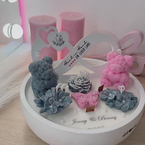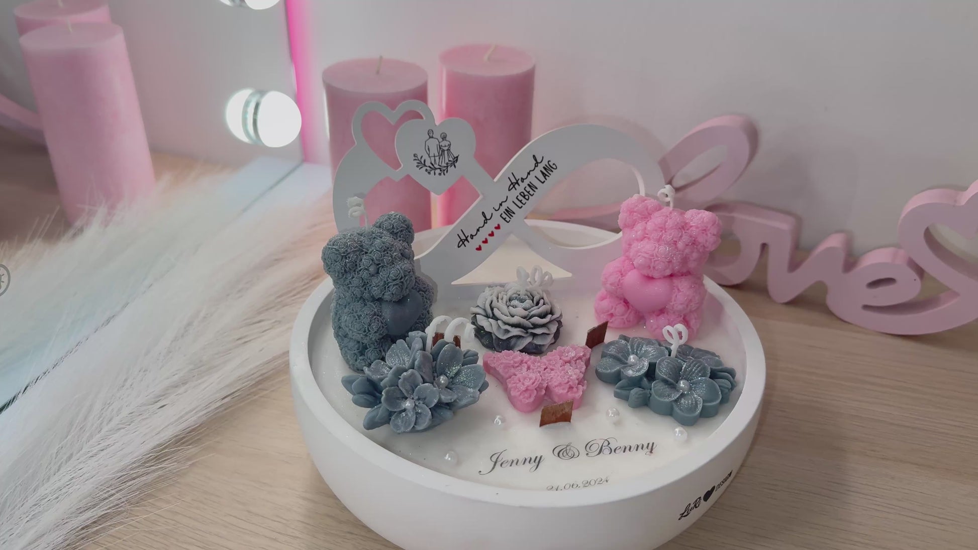 Mit zwei Rosenbären, funkelnden Blüten, Perlen, Glitzer-Effekten und einem personalisierbaren Namens- und Datumsfeld wird sie zu einem echten Highlight für jedes Paar.
